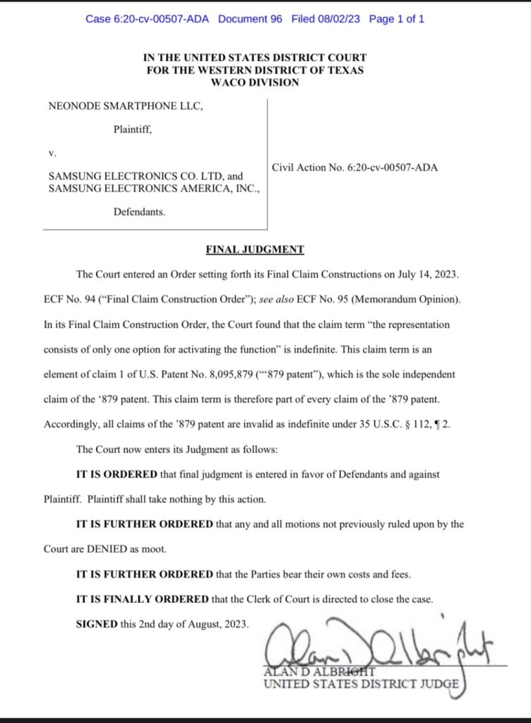Now it happens so that the judge did come out with a final judgement of invalidity yesterday (Aug 2)